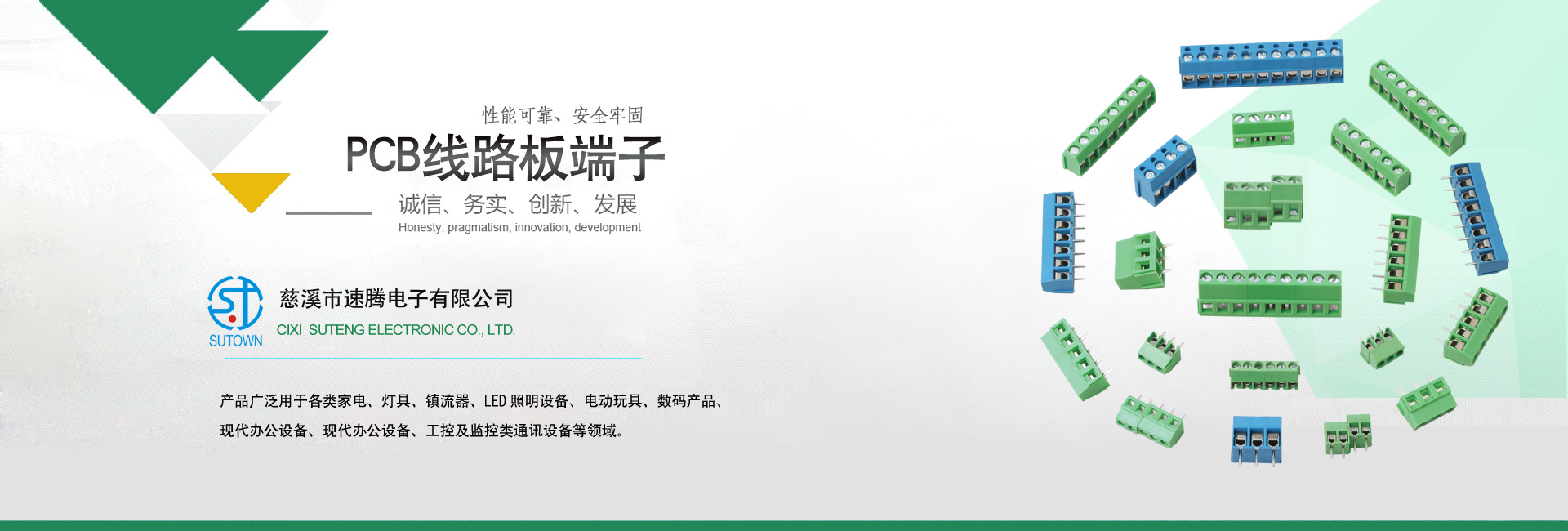 慈溪市速騰電子有限公司,是專業生接線端子生產廠家, 主要產品包話:貫通式接線端子;LED燈具端子;貼片端子;快速接線端子;插拔式接線端子;柵欄式接線端子;PCB接線端子;免螺絲式接線端子;LED電源接線端子;電氣接線端子;各類接線端子臺;歐式插座;撥碼開關;等各類連接器。